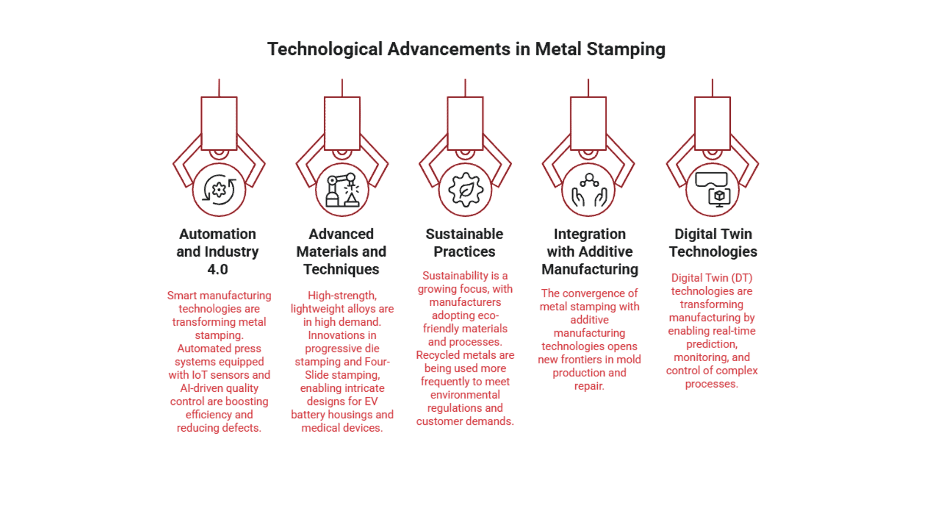 Technological advancements are also shaping the metal stamping industry. The integration of Industry 4.0 technologies, including smart systems, IoT sensors, AI-driven analytics, and advanced robotics, is transforming stamping operations. These innovations enable precise, real-time monitoring of equipment performance, defect detection, and process optimization, leading to increased productivity and streamlined operations.